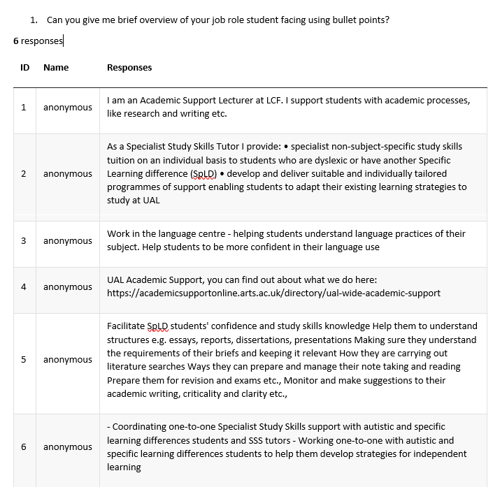 The survey was sent to Academic Support, Student Disability Services and the Language Centre (see Appendix 1). The feedback explained the support we offered, such as one on one support and assistance for neurotypical and neurodivergent students (see Appendix 1 & 2). Having used these services during my PgCert, my reflection is that I can personally relate to students who need these valuable services.
